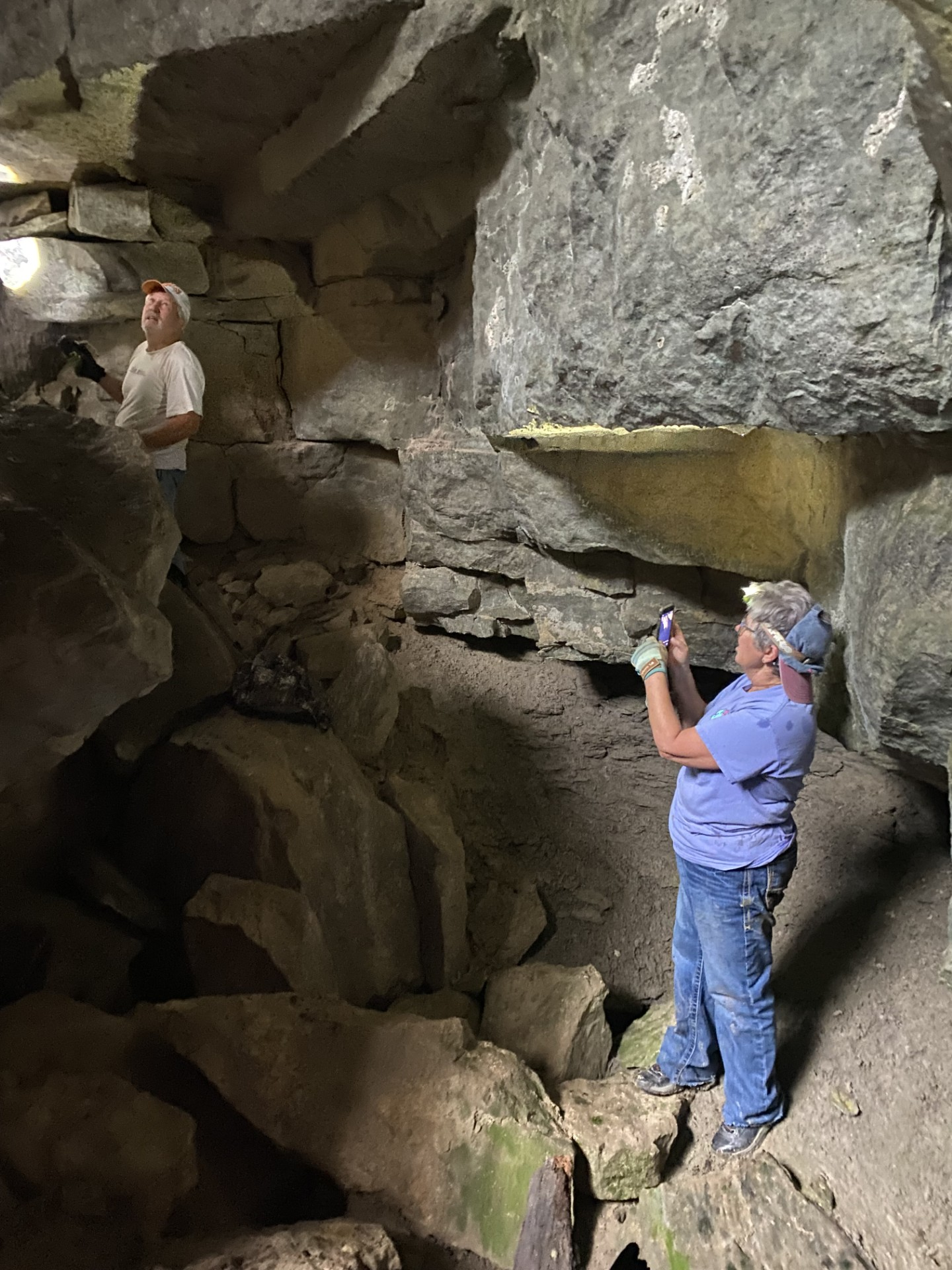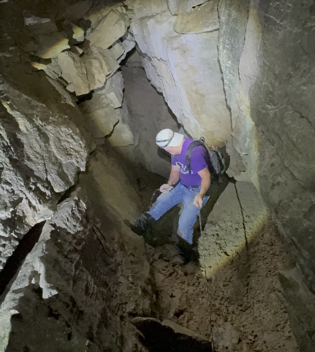The sinkhole appeared to be a fresh collapse with vegetation rocks and overburden freshly collapsed into the earth. We came back with one of our CSM supporters, Wade Delk (Barbara’s son in law). With the help of Wade, I repelled down a slot along side the rubble pile to the point that I could see the cave tunnel. However, the rubble pile, being fresh, did not appear stable. We decided to give it some time to stabilize and return with an experienced team and equipment.