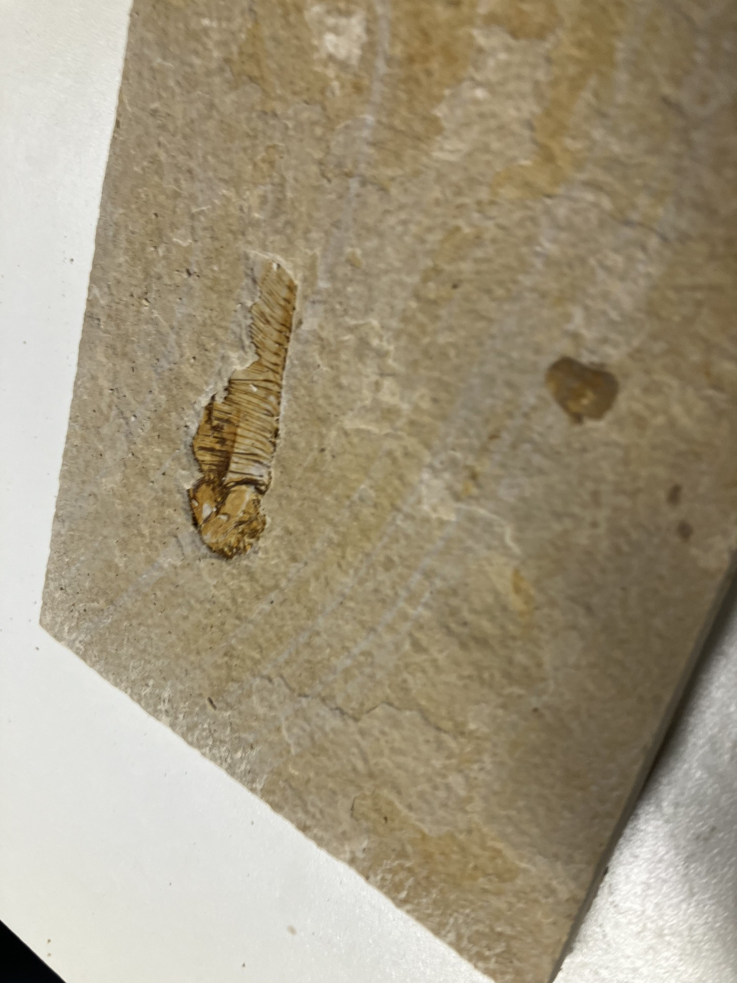 The fossil scouting was not successful but God had a special plan for our trip that we could never have anticipated. While sitting outside our RV the morning we were to leave, I was having some quiet time praying and reading a Christian novel. God kept interrupting my reading by telling me to go talk to the parents of the pack of rambunctious kids playing at the three campsites by us. I approached a dad and asked if they were a homeschool group and he said no they were on fall break from a school in St Louis started by homeschoolers. I told him I was a creation scientist and asked if I could show them a fossil that shows evidence of Noah’s flood. He was excited so he gathered up the three families as I went and got out a fossil that I had picked up from a throw-away pile outside the hotel in Kemmerer on our September trip out west. Ruby had thought it was a waste and chided me for getting it out of the waste pile, after all we had so many good fossils we ran out of space to transport them back here. I guess I stuffed it in my backpack and forgot about it until we went on this trip and I found the backpack with the fossil stored in the RV. It was not a very good fossil fish but it had a little piece of fossil showing in the layer just below the messed up, worthless fossil.