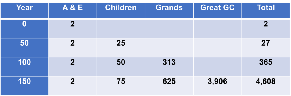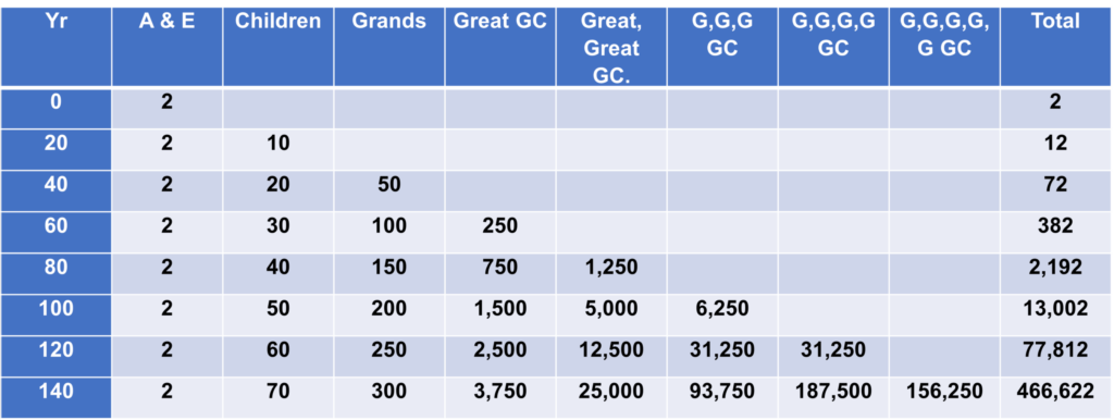 50% of the off-spring were male and 50% female and they married (5 new couples every 20 years from A&E) plus after 20 years these off-spring couples had off-spring at this same rate.