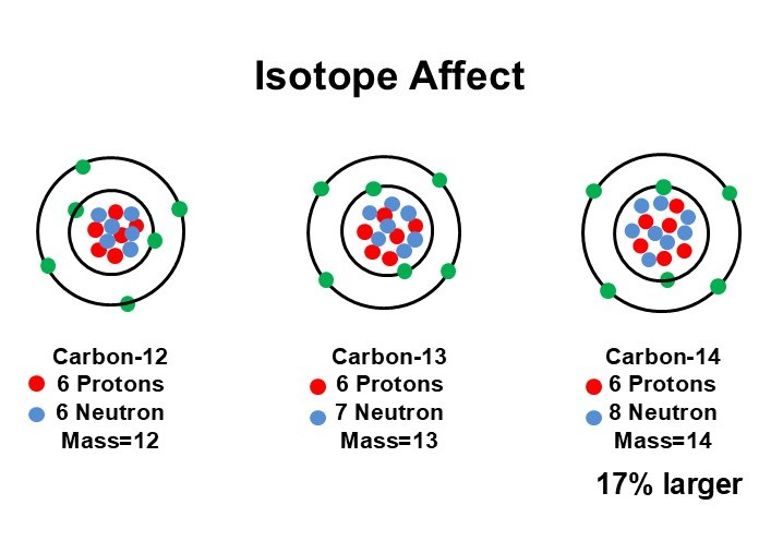 Reactions and behavior of the isotope are affected by the atom’s size. There is an isotope affect in plant uptake with a preference for 12C. Thus, lower 14C/12C in plant than atmosphere.